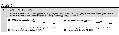 Po uzyskaniu numerów NIP i REGON przyszedł czas na wypełnienie odpowiednich formularzy wniosków o wpis i skompletowanie niezbędnych załączników. W zależności od rodzaju Waszej spółki (lub organizacji) typ formularza i konieczne załączniki będą się różnić. Tutaj uwaga, samodzielne uzyskiwanie numerów NIP i Regon ma sens tylko w przypadku spółek kapitałowych. W każdym odpowiednim formularzu wniosku o wpis przewidzianym dla każdej formy organizacyjnej wnioskodawcy, w części C1 pojawiają się pytania o numery NIP i Regon (konkretne numery pól są różne, pomiędzy 29 a 33). W sytuacji gdy macie już NIP i Regon wypełniacie pola części C1 w których należy wskazać te numery („Numer identyfikacji podatkowej (NIP)”; „Numer identyfikacyjny REGON”) a pola w których zaznacza się oświadczenie „Spółka/Podmiot nie wystąpiła o NIP” oraz „Spółka/Podmiot nie wystąpiła o REGON” należy przekreślić (jak we wzorze poniżej).